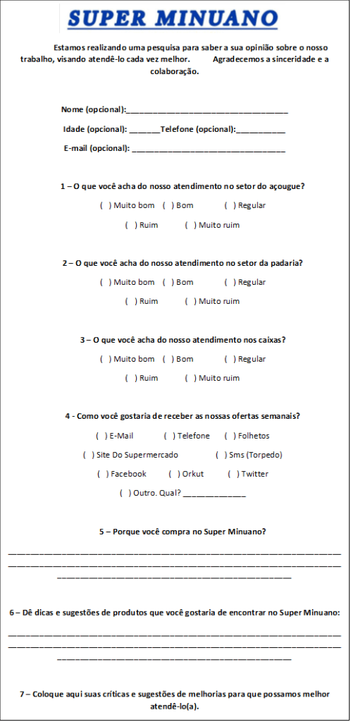 O marketing está em toda parte. Atualmente ele é indispensável para qualquer empresa, independentemente de qual seja o seu segmento. Pode-se dizer que o sucesso de uma empresa está diretamente ligado ao marketing. O objetivo principal deste trabalho é a realização de uma pesquisa mercadológica buscando a visão dos consumidores sobre os pontos fracos e fortes da empresa Super Minuano, e assim poder melhorar em alguns aspectos que talvez estejam deixando a desejar. O principal desafio é descobrir a opinião dos clientes sobre os produtos e serviços oferecidos pela empresa Super Minuano. Foi então cuidadosamente desenvolvida, realizada e distribuída uma pesquisa mercadológica na empresa. Após isso, os resultados foram recolhidos, digitalizados, avaliados e então surgiram as melhorias para solucionarem os problemas identificados.