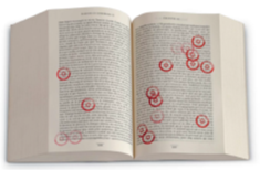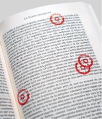 O catálogo da exposição também apresenta o livro aberto nas páginas 1494 e 1495, conforme demonstra a figura 2 e, destaca uma página ampliada Le Temps retrouvé[4] (figura 3). O livro é escrito em francês, idioma original da obra. Nas figuras 2 e 3 pode-se notar que todas as palavras temps receberam o mesmo carimbo vermelho. Na figura 3 fica mais evidente as palavras Vous êtes ici[5] escritas no carimbo.