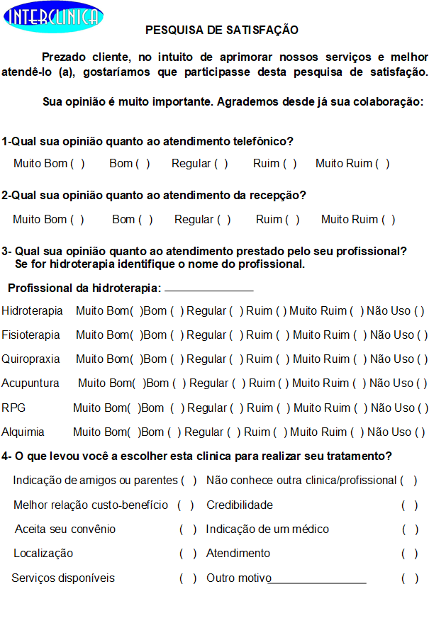 Empresas que desejam se destacar neste mercado tão competitivo devem começar a fazer uso de uma ferramenta muito eficaz que é o marketing, item fundamental para qualquer organização que tem como alvo o sucesso. Desta forma, este trabalho tem como objetivo avaliar o nível de satisfação dos clientes da empresa Interclinica Fisioterapia e Serviços Ltda. através de uma pesquisa de satisfação,procurando resolver o seguinte problema: Como identificar o nível de satisfação dos clientes da empresa Interclinica? Por meio do referencial teórico abordado no segundo capítulo foi possível ter a dimensão da importância do marketing no cotidiano de uma empresa, sendo constituído pelos assuntos marketing e seus conceitos, composto de marketing, satisfação do consumidor, relacionamento com o cliente, atendimento ao cliente, pesquisa de marketing e processos de pesquisa de marketing. Posteriormente o terceiro capítulo apresenta a metodologia, o quarto relata o desenvolvimento, onde é comentado sobre a empresa, a pesquisa realizada e seus resultados, assim como as sugestões de melhorias apresentadas para a empresa, e por fim as considerações finais no capítulo cinco.