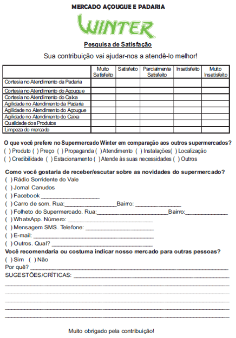 Para construir um relacionamento com o cliente, entender o mercado e o comportamento dos consumidores o marketing desempenha um papel imprescindível nas empresas, atuando dentro e fora delas. Portanto, a pesquisa de marketing é uma das ferramentas mais importantes para encontrar novas informações e conhecer as reais necessidades dos clientes. Baseando-se nesta análise, será realizada uma pesquisa de marketing no Supermercado Winter, localizado na cidade de Novo Hamburgo. Assim, o objetivo geral deste estudo é analisar a satisfação dos clientes e sugerir melhorias para o Supermercado Winter, buscando responder a questão de pesquisa: os clientes estão satisfeitos com o mix de marketing e com o atendimento prestado pelo Supermercado Winter? Este estudo tem como referencial teórico, descrito no capítulo dois, os conceitos de marketing, qualidade no atendimento, satisfação, encantamento e, pesquisa de marketing. No capítulo 3 é apresentada a metodologia utilizada e, no quarto capítulo o desenvolvimento com o histórico da empresa e a pesquisa realizada e no final, as sugestões de melhorias no atendimento, na limpeza, nos produtos vendidos, nas formas de divulgação e nos demais itens do mix de marketing.