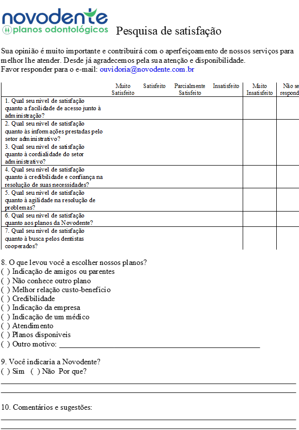 No cenário globalizado de competitividade atual, e com a diversidade de produtos e serviços que o mercado facilmente oferece, torna-se essencial e primordial um eficiente planejamento de marketing dentro da empresa, para conseguir manter-se no mercado e fidelizar seus clientes. Conforme diagnóstico realizado na empresa Cooperativa Novodente, localizada na Av. Cel. Frederico Linck, 714 sala 302, na cidade de Novo Hamburgo, verificou-se que nunca foi aplicada uma pesquisa a fim de mensurar a satisfação ou insatisfação dos clientes. Diante desse diagnóstico, decidiu-se em realizar uma pesquisa de satisfação com os clientes, assim este estudo tem como objetivo geral identificar a satisfação do cliente referente aos serviços prestados pela empresa Novodente, visando ao aprimoramento do atendimento da empresa. E, apresenta como problema: qual o nível de satisfação dos clientes da empresa Novodente? Como base para este trabalho utilizou-se referencial teórico sobre os temas marketing, atendimento e serviço, satisfação e fidelização, qualidade dos serviços, pesquisa de marketing e suas etapas. Na sequência é apresentada a metodologia utilizada, o desenvolvimento deste trabalho, detalhando cada etapa do mesmo, análise das informações, apresentação dos resultados, bem como análise dos dados obtidos com a realização dessa pesquisa e apresentação de sugestões de melhorias para a empresa conseguir aprimorar seu atendimento e prestar um serviço cada vez com maior excelência.
