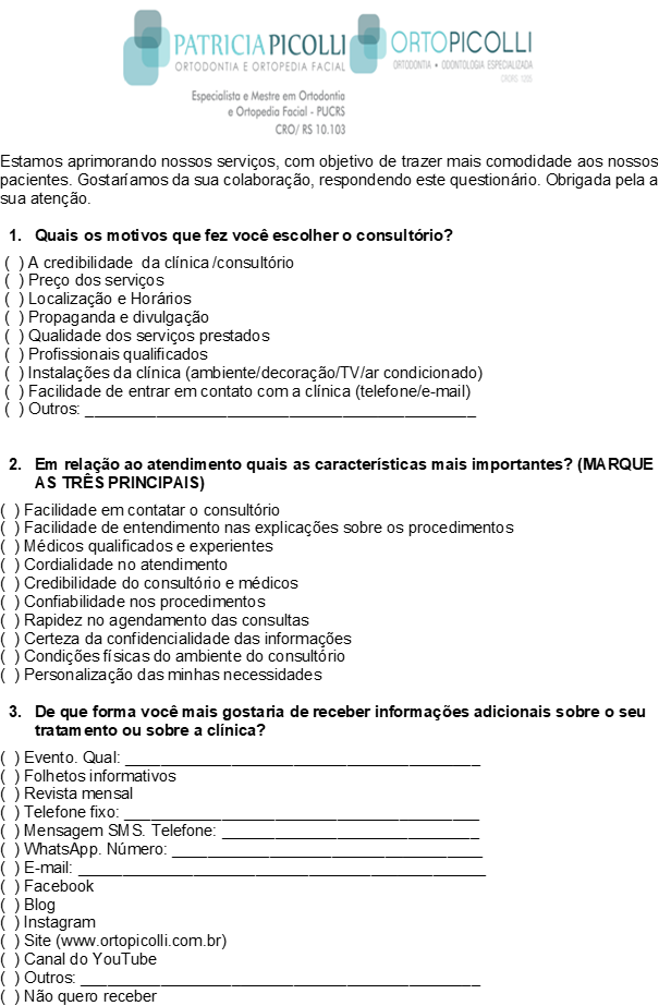 Este trabalho apresenta um estudo sobre a importância do marketing, o marketing agrega valor para cliente, proporciona uma troca de benefícios, visando à qualidade dos produtos ou dos serviços fornecidos por uma organização. As expectativas dos clientes são influenciadas por experiências anteriores, a qualidade no atendimento levará à satisfação e consequentemente a fidelização do consumidor, a relação entre empresa e cliente é tão importante quanto aos produtos e serviços oferecidos. Este trabalho tem como objetivo identificar a percepção dos pacientes, sobre o mix de marketing e o atendimento prestado no consultório da Patricia Picolli, através de uma pesquisa de marketing, com a finalidade de solucionar o problema em questão: Qual a percepção dos pacientes do consultório Patricia Picolli em relação ao mix de marketing e qualidade no atendimento? Para a construção deste trabalho foi utilizado livros de marketing e seus princípios, pesquisa de marketing e valor para o cliente. O trabalho irá descrever a importância da pesquisa de marketing em uma organização, informando os passos para uma pesquisa bem sucedida e mostrará através dos resultados como trazer melhorias para a empresa. Sugere-se para a empresa a elevação da qualidade dos serviços prestados e dos processos, mais flexibilidade nas condições de pagamento, elevar a eficiência e a atenção para com o cliente, criar mais canais de comunicação e também a criação de uma urna para os clientes depositar informações e sugestões de melhorias para o consultório, com estas sugestões a empresa poderá melhorar cada vez mais os seus serviços.