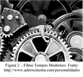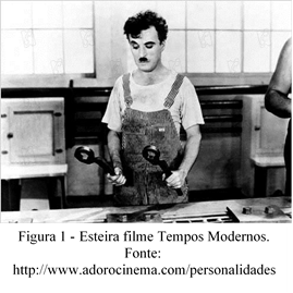 Chaplin é considerado um dos grandes personagens do cinema, seus filmes foram notadamente marcados por elementos de crítica social. A figura 1 apresenta uma cena do filme “Tempos Modernos”, que ilustra um operário de uma fábrica trabalhando em uma esteira. Sua função era apertar parafusos, mas, ao longo do filme o personagem não consegue acompanhar a esteira que segue cada vez mais rápida e termina “enlouquecendo” e, entrando na máquina gigantesca (figura 2).