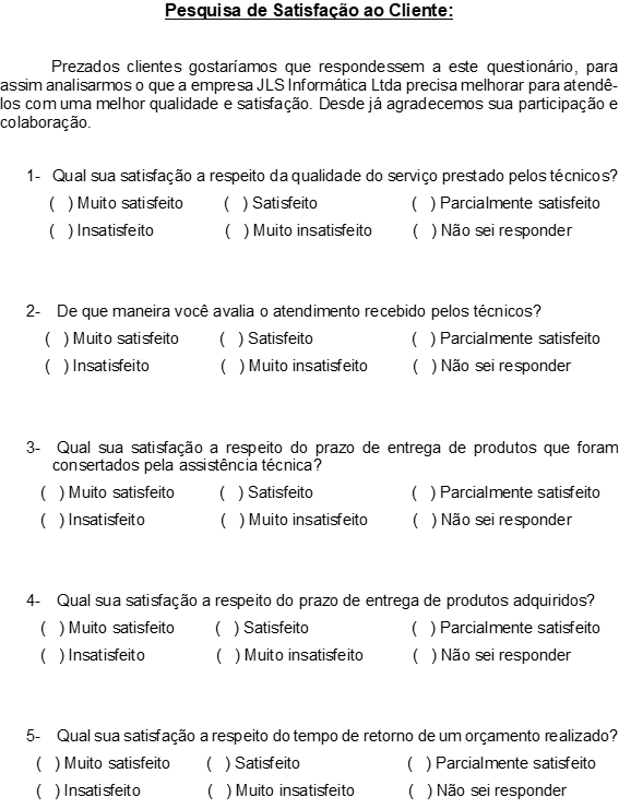 Esse estudo teve como objetivo principal implementar uma pesquisa de satisfação aos clientes da empresa JLS Informática Ltda. Para se obter um contato mais direto com o cliente, fazendo com que este se sinta importante para a empresa em questão, analisando os serviços e atendimentos recebidos, como também os pontos fortes e os que deverão ser melhorados. É importante conquistá-los e obter sua confiança pela prestação de serviços da empresa, passando uma imagem positiva para os consumidores. Para a fundamentação deste estudo, procurou-se pesquisar o referencial teórico em livros de Marketing, onde foi estudado o atendimento aos clientes, especificado cada etapa de uma pesquisa de Marketing, suas classificações e formas de pesquisa, conceituação de questionário, explicado as principais escalas de mensuração, analisado os procedimentos de amostragens para a realização de uma pesquisa e os métodos para a realização de um questionário e, por fim, relatado o estudo de caso. Sendo assim, concluiu-se que a pesquisa de satisfação aos clientes é de suma importância para as organizações, pois conseguem ter uma ligação direta com os consumidores; fazendo com que se crie um melhor vínculo e receba as informações diretamente. Portanto, a empresa pode tomar as decisões para solucionar os problemas diagnosticados no andamento da pesquisa.
