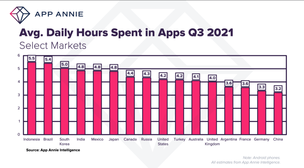 O relatório da App Annie descreve que o tempo médio diário gasto em aplicativos em smartphones no terceiro trimestre de 2021 em três países ultrapassou 5horas.
